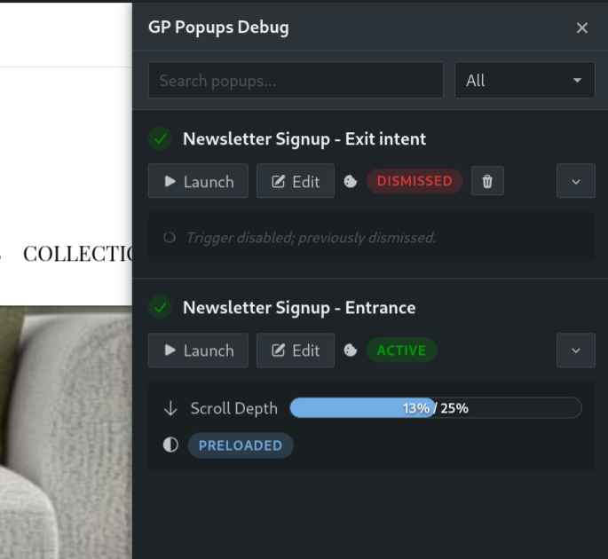 Firstly, a wonderful popup debugger (pictured) which allows site admins to see why a popup was triggered, how far away it is from being triggered and removing cookies etc. It’s absolutely beautifully designed for something as simple as a debugging tool, and allows for comprehensive testing which is crucial in ensuring popups are as effective as they can be. Yes, a lot of people hate them but they do drive attention and messaging, but targeting them to not be annoying is important!