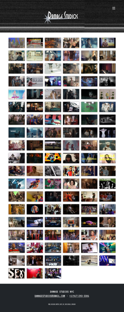 The website required a very simple design, which we also included the animated TV static header to bring some “aliveness” to the images taken from media projects from both Damage Studio’s work being put together, but also usage in the final production.