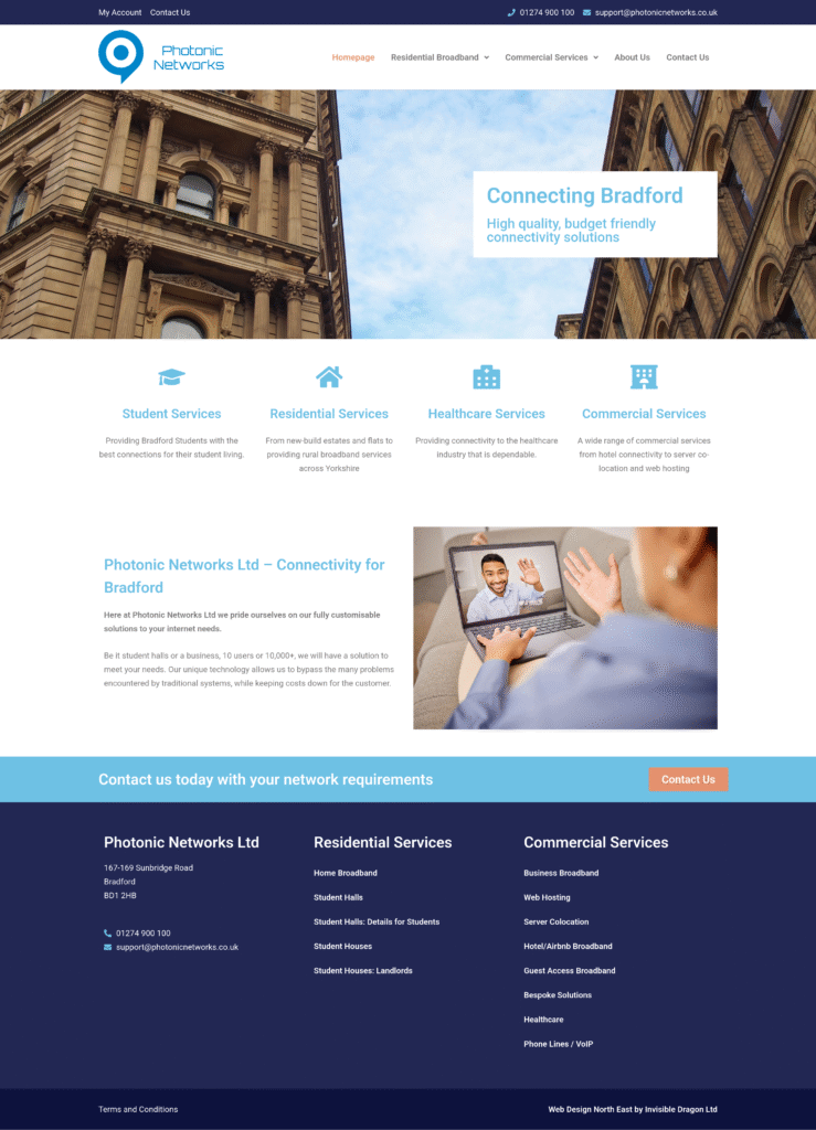 Invisible Dragon worked with Photonic Networks, a leading networking provider in Bradford to develop their new website. Photonic provides a wide range of connectivity services from student services, to healthcare and to server hosting solutions backed by a friendly local team.